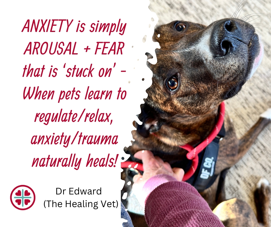 Of course, every anxious animal is experiencing fear and distress emotionally and mentally at the same time. That’s because whatever the thing is that is triggering anxiety is – is something that this dog has decided is scary, life-threatening, and fearful (even if it’s just the sound of a sausage sizzling in the pan). That’s important to understand.